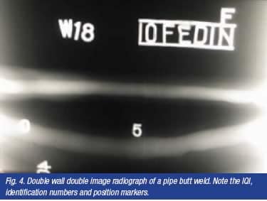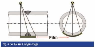 The last technique is double wall, double image (DWDI), generally used only on pipes less than 75-80mm in diameter. By offsetting the source from the weld centre line and using a long source to film distance it is possible to project an image onto the film of both the upper and the lower parts of the weld as shown in Fig. 4. As with the DWSI technique multiple exposures are required to achieve complete coverage.